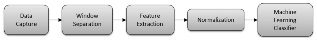 The 9 × 2 was used in a medical application, as part of HELP project, in which it provided the information to a clinician to remotely regulate an apomorphine pump. Doses administrated by the pump were increased when patients were in OFF state, a motor state mainly associated with a lack of medication. This OFF motor state was determined through a gait analysis performed in real-time by the 9 × 2 [21]. As a first step of this gait analysis, the 9 × 2 establishes if patient walks. To this end, artificial intelligence algorithms were introduced within the MCU in order to behave as an online device. Specifically, Short Time Fourier Transform and Support Vector Machines have been implemented in the MCU in order to lighten its work load. The scheme of this gait detector implementation followed a classical classification problem approach, which can be divided into different parts as shown on Figure 7: data capture, window separation, feature extraction and machine learning classification [82].