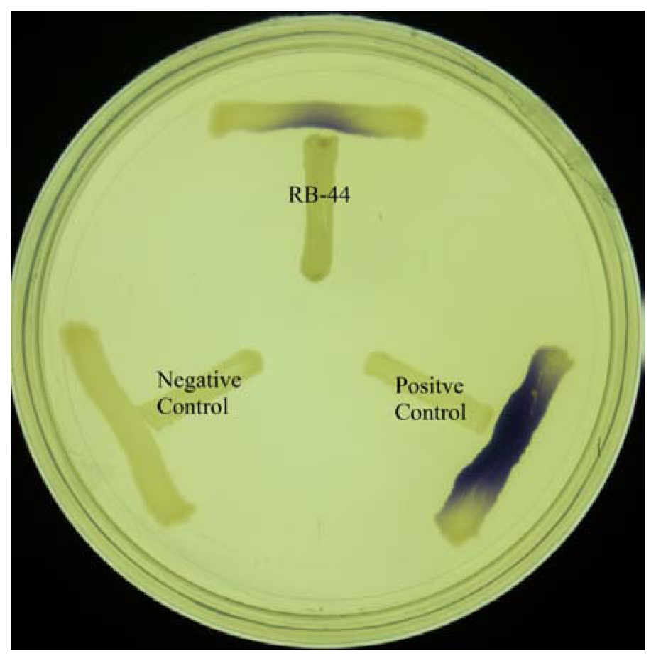 About 60 strains were isolated after four cycles of enrichment in KGm medium with 3-oxo-C6-HSL as the sole carbon sources. Preliminary screening for AHL production using C. violaeum CV026 biosensor (Figure 1) suggested strain RB-44 showed QS activity and moderate quorum quenching actitivity for 3-oxo-C6-HSL (data not shown). Strain RB-44 was selected for further QS analysis since it triggered C. violaeum CV026 biosensor purple pigement formation and subsequently reconfirmed its AHL production by using E. coli [pSB401] bioluminescence assay (Figure 2).