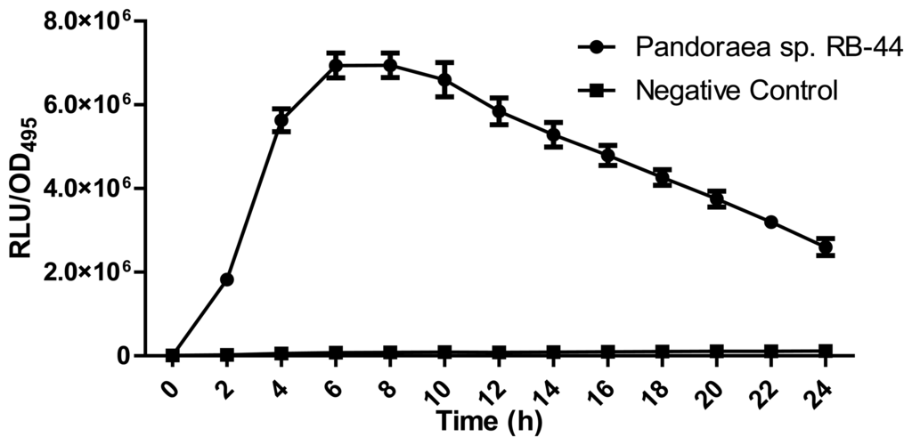 Here, we present a strain of Pandoraea sp. RB-44 isolated through four cycles of enrichment in KGm medium [21] from an ex-landfill site that activates both C. violaeum CV026 and E. coli [pSB401] biosensors. Subsequently, we used matrix-assisted laser desorption ionization time-of-flight (MALDI-TOF) mass spectrometry analysis for strain identification and high resolution quadrupole mass spectrometry to confirm its AHL profile. To our knowledge, this is the first report of AHL production by Pandoraea sp.