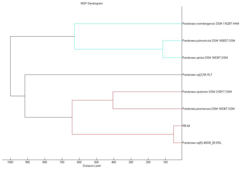 MALDI-TOF MS is a rapid and yet promising means of accurate identification of microorganisms [35], especially for the Pandoraea genus that is often misidentified as Burkholderia spp. or Ralstonia spp. [31]. In this study, MALDI-TOF MS result accurately showed that the closest match of the RB-44 isolate is Pandoraea sp.with a best match score value of 2.415 and P. pnomenusa as the second best match (score value of 2.382) in the MALDI-TOF Biotyper Real Time Classification software. MALDI Biotyper MSP software also showed a closer match to Pandoraea sp. (Figure 3).