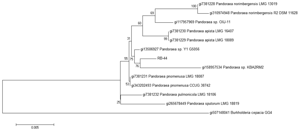 The identity of strain RB-44 is also confirmed by 16S rDNA sequencing showing that it clusters within the Pandoraea genus. The sequence was subsequently deposited into GenBank with the accession number KF648559. A phylogenetic tree was then constructed using Mega 5 software to align it with other rDNA sequences obtained from GenBank. Based on the phylogenetic tree obtained from MALDI-TOF and 16S rDNA sequencing (Figure 4), it appears that strain RB-44 could represent a new species of Pandoraea genus. However, more research should be to be conducted to confirm this finding.