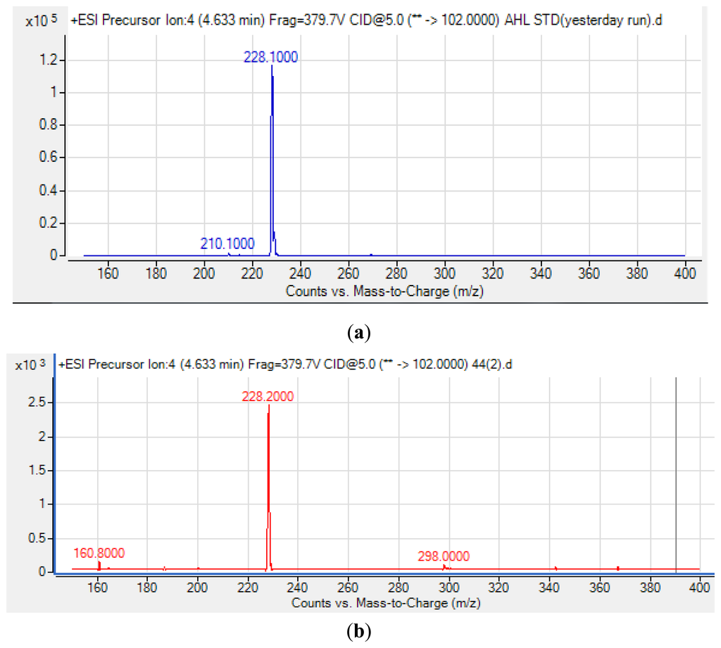 Many cystic fibrosis-causing agents such as Pseudomonas aeruginosa and Burkholderia spp. have been reported to possess QS properties as a mechanism to regulate virulence. As an opportunistic pathogen with an unclear role, Pandoraea spp. have repeatedly been isolated and reported to be co-colonizing species in cystic fibrosis patients [5,31,34]. Thus, identification of the Pandoraea spp. AHL profile is the first step to understand this potential opportunistic pathogen. The spent culture supernatants of Pandoraea sp. RB-44 was analyzed using an Agilent 6490 Triple Quadrupole LC-MS/MS system. Mass spectrometry analysis of the supernatant of Pandoraea sp. RB-44 confirmed the presence of N-octanoylhomoserine lactone (C8-HSL) (m/z value of 228.200) (Figure 5).