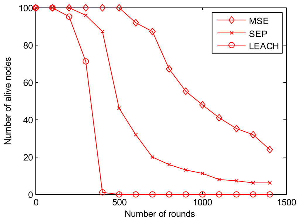 Figure 10 shows the number of live nodes during the simulation lifetime. We choose 1,500 rounds here to have clearer view. We can find that the time when the first node dies in MSE is much longer than that in LEACH and SEP, nearly 2.5 times longer than SEP and 5 times longer than in LEACH. Figure 10 also indicates that the number of live nodes decreases more and much faster as time goes by.