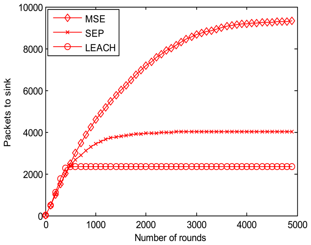 Figure 11 shows the number of packets received by the sink. As illustrated, the result shows that MSE has a higher number of data received than LEACH and SEP. In the first 200 rounds, the three proposed algorithms have nearly the same packet delivery numbers. However, after 500 rounds, the sensors in the network with the LEACH protocol drain out totally and transmit no packets, while SEP and MSE continue delivering and forwarding data. The network using SEP drains out at about 2,500 rounds, while MSE lasts for almost 5,000 rounds. The amount of packets received by the sink node in the network using the MSE protocol is thus about 4 times larger than that of LEACH and 2 times larger than SEP.