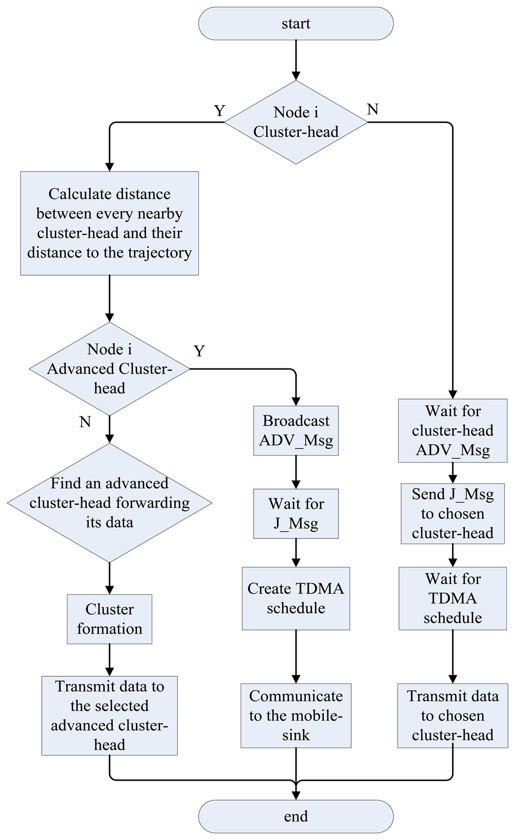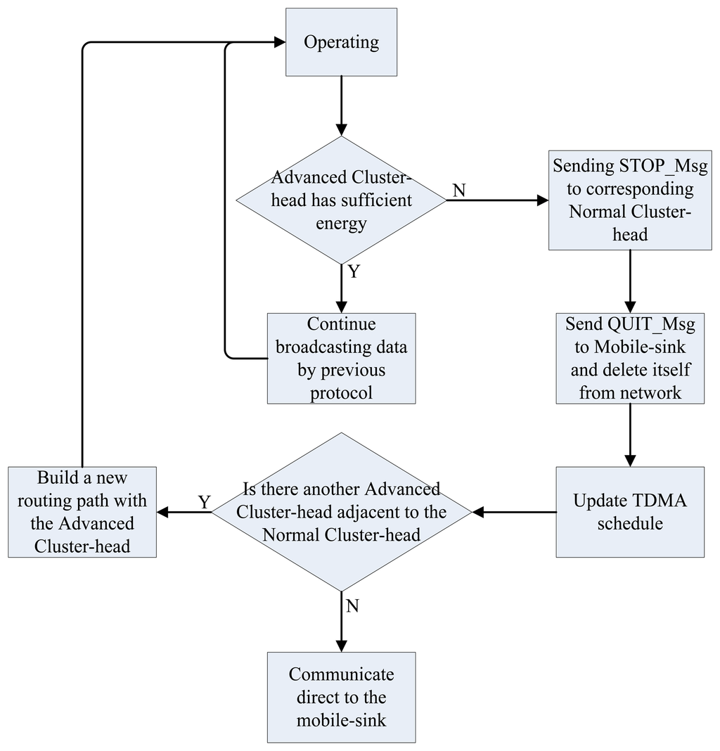 To solve this phenomenon, calculating the residue energy of any advanced cluster head is recommended. As shown in Figure 7, once the residue energy is not sufficient for the next data transmission and forwarding, it will send a STOP_Msg to its corresponding normal cluster head and delete itself from the sensor network. In the meantime, the TDMA schedule ought to be updated. After the normal cluster head receives the STOP_Msg, it will compare its distance to the adjacent advanced cluster head and trajectory. From this step on, the procedure is exactly the same as the set-up phase. As illustrated in Figure 6, once the original advanced cluster head dies, the corresponding normal cluster head carries out the procedure above immediately, and forwards its data direct to the mobile sink.