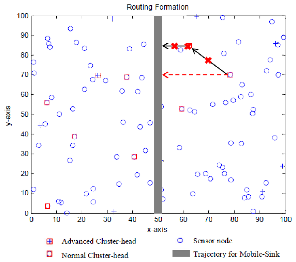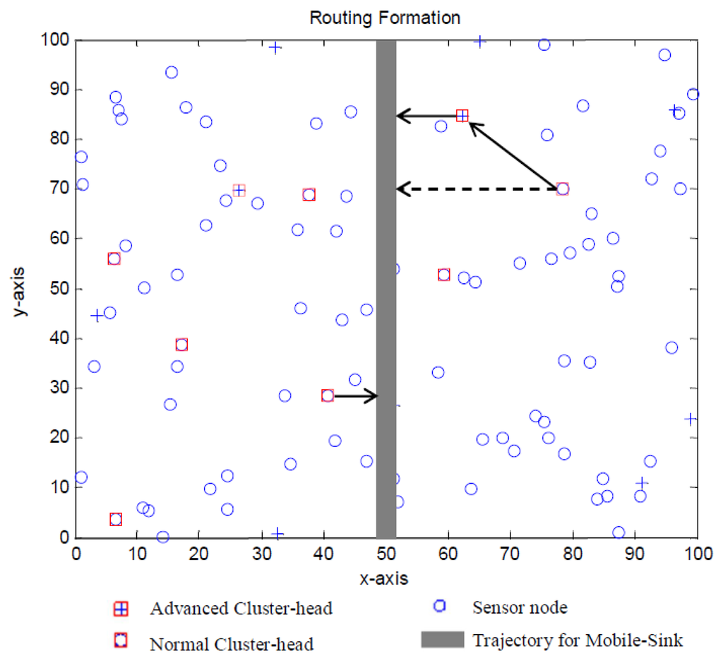 The use of mobile sinks can potentially provide energy-efficient data collection with well-designed networking protocols for WSNs [27]. When using the mobile sink in practice, the sink nodes can be attached to vehicles, animals or people that can move inside the region of interest. Usually, static sink nodes are not very efficient [28]. Although single hop data collection is feasible in networks deployed in small regions, the multi-hop transmission manner is more commonly used in large sensor areas [29]. Intuitively, mobile sinks gain advantages by mitigating the so-called hot spot problem, balancing energy among sensor nodes, prolonging network lifetime, reducing transmission latency, and improving network performance by periodically accessing some isolated nodes into the network.