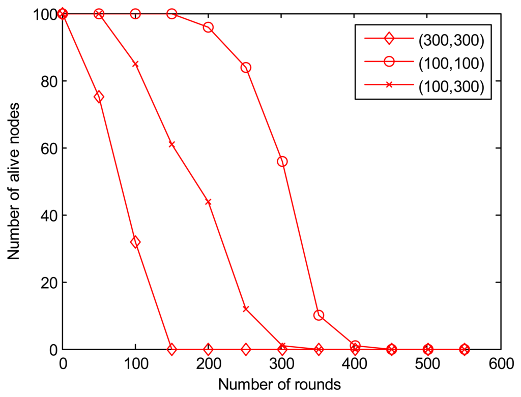 Figure 8 shows that the energy consumption increases when it gets further away from the sink node, which shortens the network lifetime. The MSE algorithm consumes less energy with the mobile sink inside the network. However, we cannot explain why the decreasing rate of live nodes get slower in round 150–200 while the fixed sink lies in location (100, 300). To our best knowledge, this phenomenon may be caused by the uniform distribution.