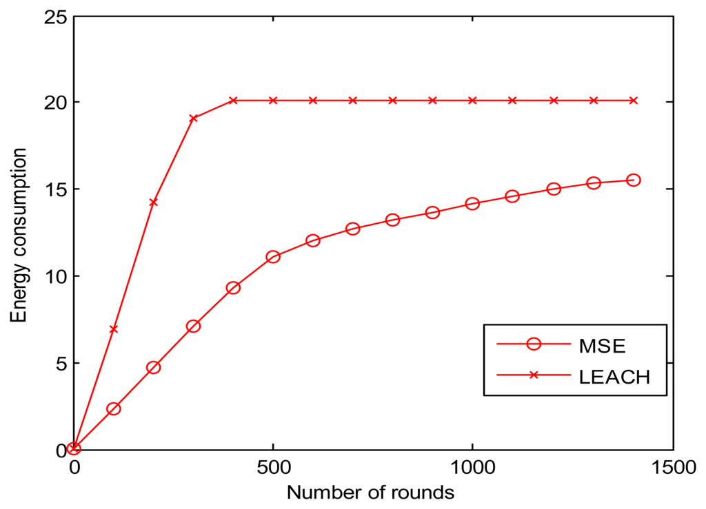 Figure 9 shows that the energy consumption rate of LEACH is much larger than our MSE. Consequently, the energy in a LEACH network get drained much earlier than in a MSE one at the location about 400 rounds away from the sink node. The MSE energy consumption for both methods are almost linear before 500 rounds, while the linear part for the energy consumption curve of LEACH is before round 150. For the better illustration of these two energy consumption curves, we only choose the data within 1,500 rounds in order to magnify the bi-linearity of the energy consumption curve of LEACH.