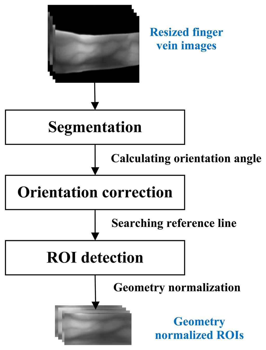 An effective and robust finger vein ROI localization method is essential for a finger vein identification system. In this section, we detail the proposed method, which consists of segmentation, orientation correction, and ROI determination, and which is illustrated in Figure 1. In order to reduce the processing time, the acquired image with 480 × 640 pixels size is resized to 120 × 160 primarily with “bicubic” interpolation. The details of each step are described as follows.