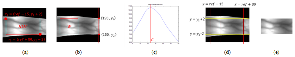 Furthermore, different from the method based on searching the reference line in the first knuckle [6], in this paper, the ROI of finger vein image is defined as a fixed region, based on the reference line in the second knuckle. This is determined owing to the excogitation of our imaging device. Since near infrared light can easily penetrate the articular cartilage [23], the gray values of the pixels in knuckles are larger than other parts, which results in larger accumulated value of the parts in the knuckles than other regions. Hence, with vertical projection of the image, the column with accumulated value that has maximum value can be the reference line for ROI detection. As shown in Figure 10a, ROI is defined as a rectangle determined by two points, r1 = (ref −15, y1 + 2) and r2 = (ref +80, y2 − 2). All constant parameters used for ROI detection are selected through experiments. The procedures for ROI detection are described as follows: