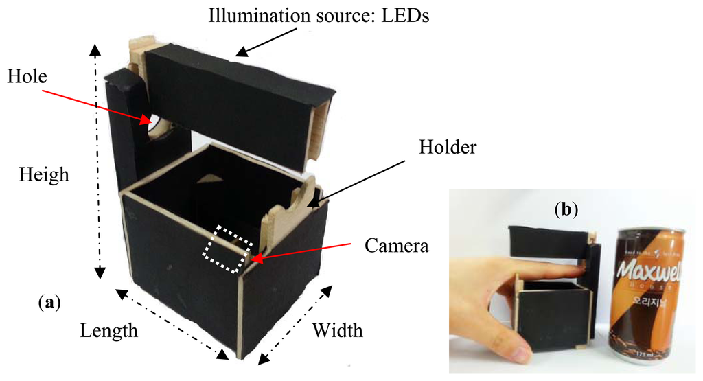 As shown in Figure 11a, the lab-made imaging device is composed of a camera with an infrared light passing filter and an array of infrared LEDs of 850 nm wavelength. For the sake of improving the convenience for image collection, a holder is added on the back of the device, and a hole is punched that is larger than the thickness of the top of an adult's finger. In addition, a USB interface is applied for power supply to allow the portability. As shown in Figure 11b, the size of our device is 6.8 × 5.4 × 10.1 (length × width × height: cm), which is about the same height as a can of coffee.