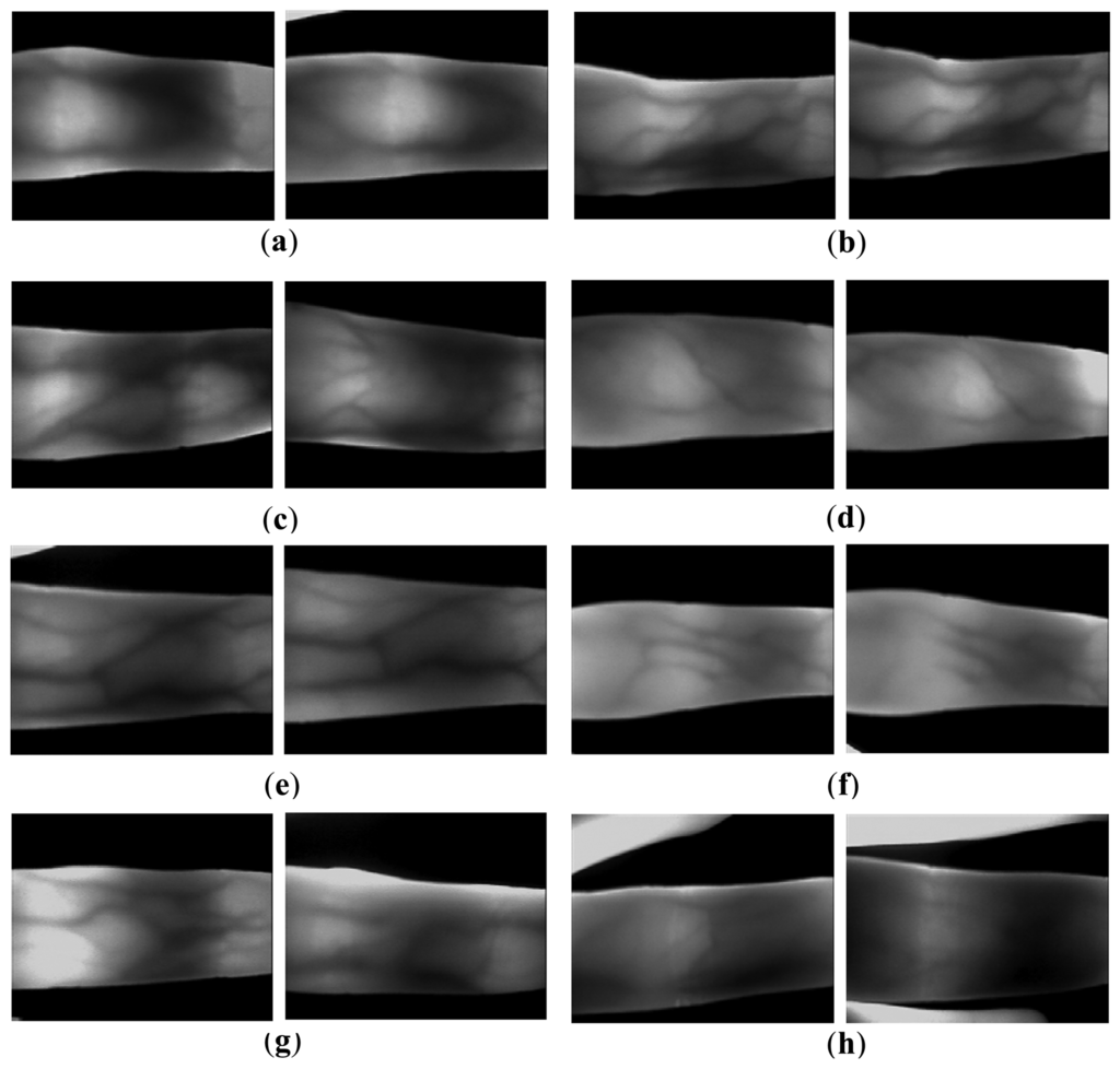 Figure 12 shows the influences of different kinds of factors on finger vein images. All the influences enhance the difficulty of correct ROI localization. Translation, orientation, scale, and rotation, as shown in Figure 12a,b,d,e, may result in wrong regions of interest (ROI), which will increase the probability of erroneous matching. The quality of finger vein images (Figure 12c) is always poor because the scattering effects can greatly reduce the contrast between the venous and non-venous regions [27]. For the effect from pressure shown in Figure 12f, the inaccurate ROI may be obtained even though there is a correct ROI detection. The factor of uneven illumination displayed in Figure 12g will mistake the vertical projection. Moreover, since the finger beside the captured finger shares the IR light, the IR light for the captured finger is not enough. In this way, the vein image from the captured finger is shown blacker than those in the normal case, as shown in Figure 12h. This factor always affects the accuracy of finger region segmentation.