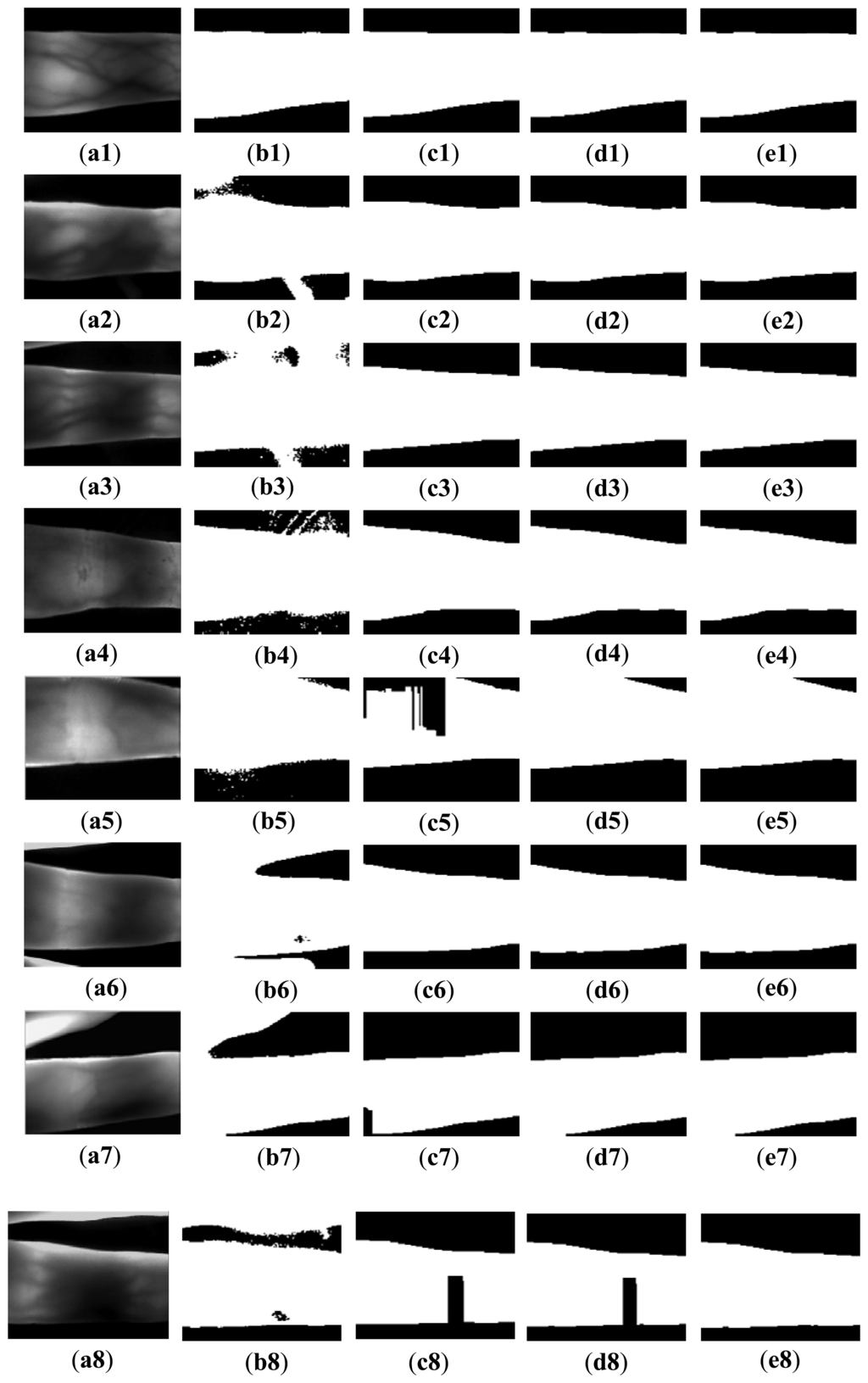Figure 13 shows the segmentation results using the above methods and the proposed method. Figure 13a1 is a normal image, with good image background and image quality. Owing to the uneven illumination, the left upper finger region in the image Figure 13a2 is brighter than other regions. There is some parasitic light in Figure 13a2,a3. The image in Figure 13a4 is acquired from a volunteer whose age is 72 years old. The factors causing the complicated background from Figure 13a5 to Figure 13a8 result from image collection for the index and ring fingers, improper collection posture, and scattering. It is ascertained that Otsu's thresholding method and the method using edge mask are not robust for segmentation. For Otsu's thresholding method, some segmentation errors appear in the outputs, due to the influences from illumination, parasitic light, and useless finger parts. The mask based method [22] can solve these errors. However, the method using the mask is invalid for the influence from scattering and incomplete finger.