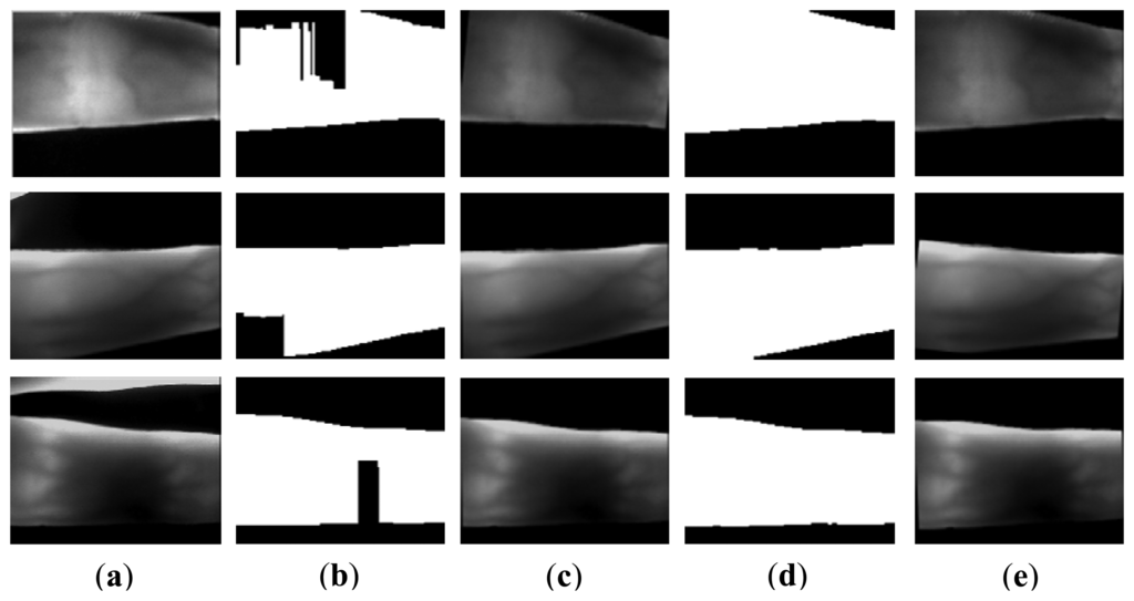 Since the height of the ROI varies with different fingers, geometry normalization is necessary to eliminate the geometrical variations. In this paper, all localized ROIs are normalized to 60 × 128 pixels with ‘bicubic’ interpolation, like Figure 10e.