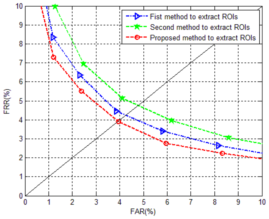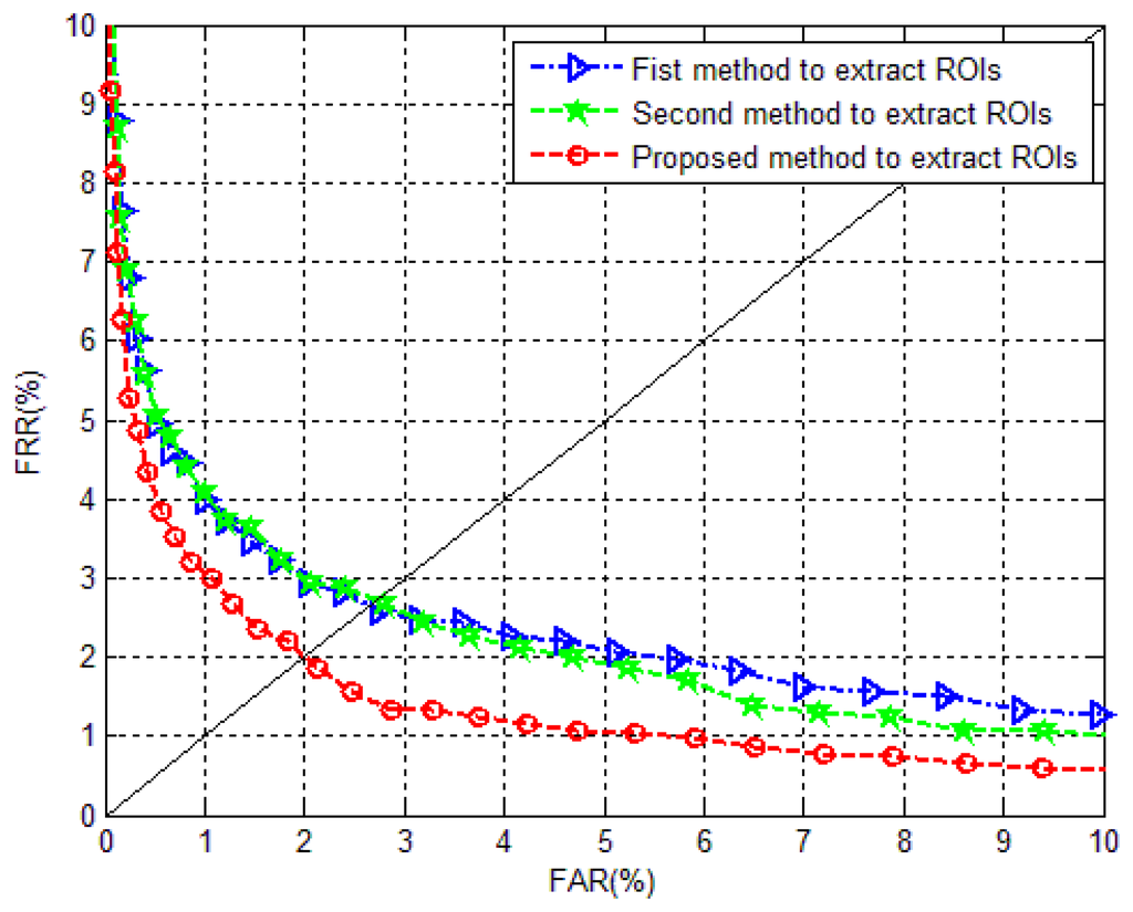 The matching performance is compared in this experiment, to evaluate the effectiveness of the extracted ROIs. Three kinds of ROIs are all extracted from the correct segmented images, using the proposed segmentation method. The first method to extract ROI is using the method in [23,25,26], which means the processed images are projected to search the reference line. Image orientation correction is operated in obtaining the first ROIs. The second method is using the truncated images extracted from segmented images, to seek the reference line [6]. There is no orientation correction in the process of ROI detection. The third case, detecting ROIs from the block image truncated from processed images for reference line searching, is the proposed method.