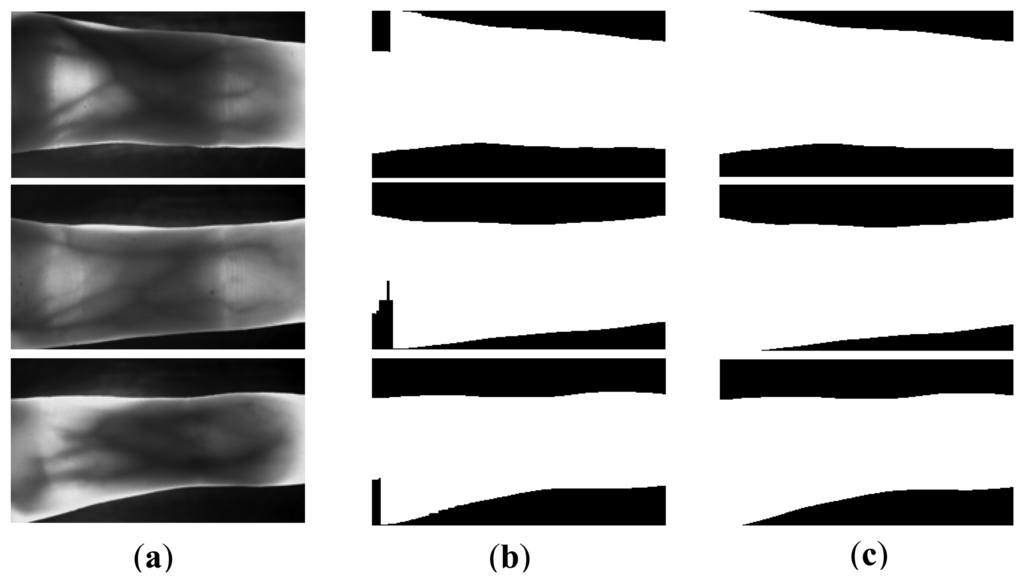 For the images from UTFVP [32], it is illustrated from Figure 17 that the similar segmentation errors (e.g., Figure 5c3,c4) appear in the Figure 17b, when directly using the mask based method [22]. With removal of the false background using the proposed method, accurate segmentation results are achieved, as shown in Figure 17c. For 1,440 finger vein images in UTFVP, the proposed method can also achieve segmentation accuracy of 100%, which demonstrates the good portability of the proposed method. This partly attributes to the pure background of the images in UTFVP. In this experiment, the threshold Thr is 150 and the acquired image is reduced to half of its size.