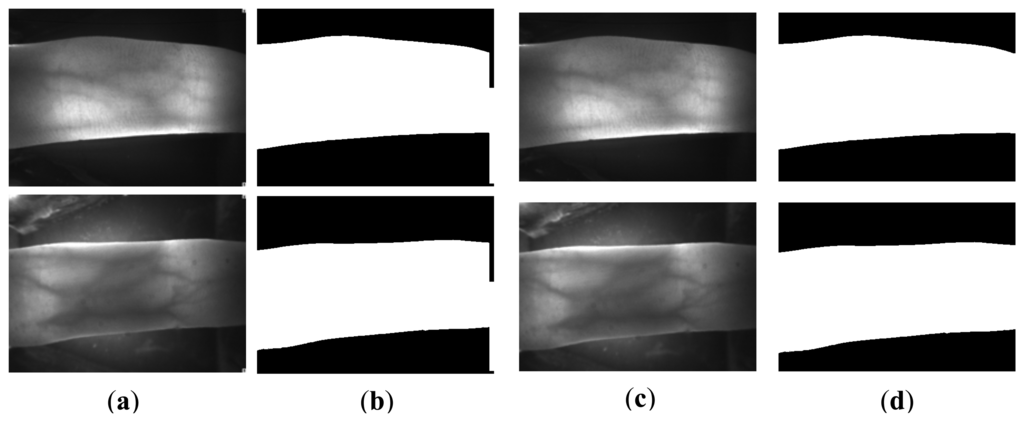 Images included in the PKU Finger Vein Database [33] from Peking University have dark background, but the complicated inner structure of the imaging device and the image tags in the right corners of each image produce fake finger contours. Hence, inaccurate segmentation results are achieved, as shown in Figure 18b. However, when we delete the top and bottom finger parts that include the image tags (Figure 18c), accurate segmentation results are achieved by using the proposed method.