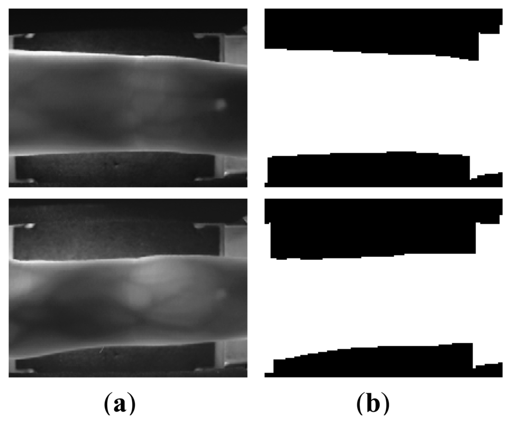 In this part, the segmented images are rotated according to the estimated orientation angle. For the images with false backgrounds (e.g., Figure 9a), the orientation corrected angle θ can be employed to correct the orientations of the correct segmented images. Since there is no false background in the binarized images obtained from the acquired images with correct background, all the middle points are utilized to compute θ using the LSE method. Hence, with the orientation corrected angle θ, the segmented images can be rotated using “bicubic” interpolation. In this paper, the acquired image will be orientation corrected with the condition that the absolute value of θ is larger than 1 degree.