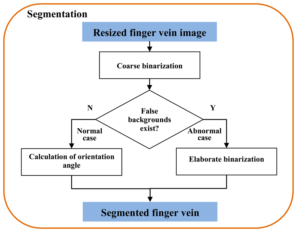 Owing to the complicated background of the captured images, the acquired finger vein images are divided into two cases: normal case and abnormal case. This is decided according to whether false backgrounds exist in the coarse binarized image. The images without false backgrounds appearing in their coarse binarized images are considered as the normal case. Otherwise, it is identified as the abnormal case. Figure 2 shows the block diagram of the segmentation process in this paper. For a coarse binarized image without false background, the orientation angle is computed for image orientation correction. For those with false background, elaborate binarization is necessary for accurate finger region segmentation.