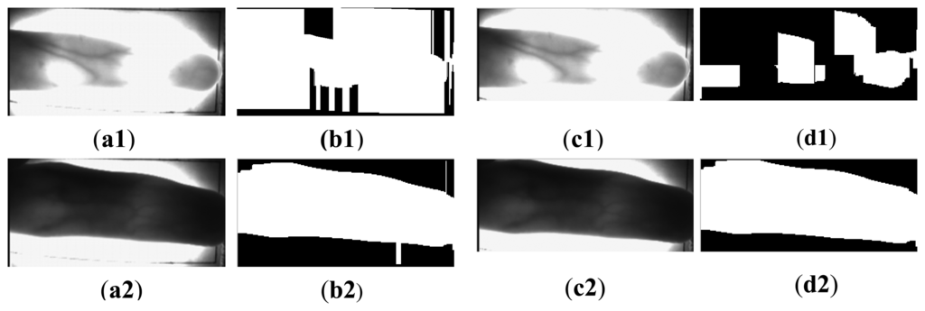 Images in the Hong Kong Polytechnic University Finger Image Database [35] have bright backgrounds, so we can use the proposed method for the segmentation by applying filters in reverse. The filter of Figure 3d can be used for the upper image and the filter of Figure 3c can be used for the lower image. However, the rectangle used to guide the finger brings the fake finger contour. In addition, the missing finger region, duo to the uneven illumination and the finger structure, also results in the wrong segmentation results shown in Figure 20b1,b2. To deal the influence from the black rectangle, the same method that removes the top and bottom finger parts is applied. The entire finger vein images in this database are firstly reduced to its half size, and the 4 and 14 rows of the top and bottom image parts are incised, respectively. Then the extended edge operators are performed on the processed images. By doing this, accurate segmentation results are achieved, as shown in Figure 20d2. Unfortunately, as shown in Figure 20d1, the same operation cannot solve the problem caused by the uneven illumination. The post-processing must be employed to obtain the accurate segmentation results.