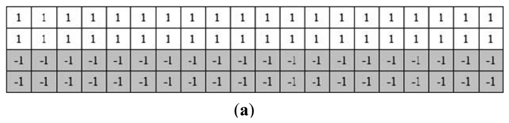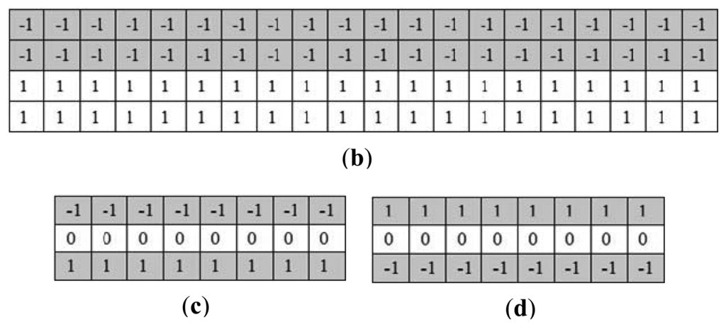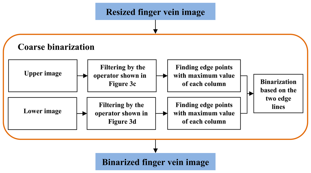 For the finger vein images in the normal case, the finger region is segmented using the binarized image. In the normal case, since the finger region is brighter than the background region, it is easy to localize the finger region from the captured image. In [22], a finger vein image is horizontally divided into upper part and lower part of the same size. Then, two masks (Figure 3a,b) is utilized for finger region binarization. The essential idea of this method is to detect two edge lines from the upper and lower images. With the mask operation, the contour of the finger can be localized, by detecting the maximum values for each column from the filtered image. The region between the detected upper contour and lower contour is then binarized to 1, to be the foreground. On the contrary, the pixels outside the finger region are set to 0, to be the background. Inspired by it, an extended operator shown in Figure 3c,d that extends the Prewitt operator is proposed to segment the finger region. The process of coarse binarization is described in Figure 4.