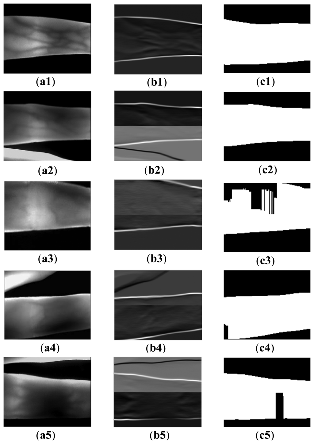 Figure 5 displays the binarization process of the finger region using the proposed edge operators. A given image (e.g., Figure 5a1) is divided into two sub-images, upper one and lower one. The masks of Figure 3c,d is then applied to upper one and lower one respectively, according to the direction from the center line to boundary lines of original image. Because of this directionality of each filter mask, the change from brighter one to darker one make a bright line and the change from darker one to brighter one make a dark line. The upper and lower filtered images are then normalized to 0–255, and combined together to form an integral filtered image (e.g., Figure 5b2). For the filtered images, Figure 5b1,b2 clearly shows that two complete edges appear in the upper and lower part of the filtered images. Even for the image (Figure 5a2) with the useless finger part, and influence from uneven illumination affected by absorption of the useless finger, the proposed edge operators can also segment the finger region well. However, the proposed operator is not robust for the cases shown in Figure 5a3–a5. Since the upper finger contour is not completely shown in the captured image (Figure 5a3), there is a broken finger edge in the upper part of the filtered image. The same case with false background appears in the left lower part of Figure 5a4. Although a very small finger region disappears in this kind of acquired image, it can also be recognized according to our experimental result, with the assumption of accurate finger segmentation result. The false background that exists in Figure 5c5 is attributed to scattering [7] and uneven illumination [8]. The scattering effect can greatly reduce the contrast between the venous and non-venous region [27]. In addition, the useless finger region shares the infrared light, which results in the lower finger part absorbing less infrared light than the upper part. Hence, a false background exists in its binarized image.