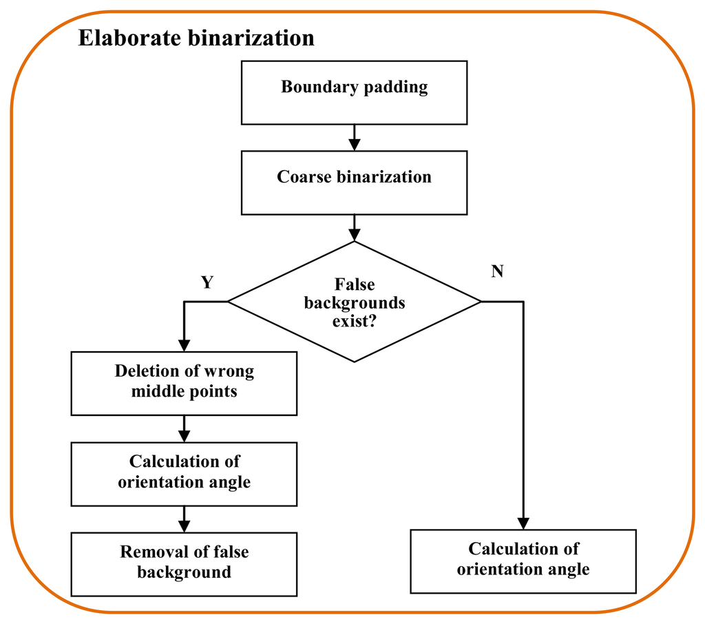 Hence, these two methods are not robust for some variations from the external and internal factors. As shown from Figure 13e1 to Figure 13e8, the proposed method can correctly segment the acquired images with the influences from illumination, scattering, parasitic light, and useless background. Compared with the results (Figure 13e1–e8) using the mask based method [22], the proposed method has higher robustness than the masks displayed in Figure 3a,b. With the accurate edge information, an accurate orientation correction angle can be estimated to guide the image orientation correction.