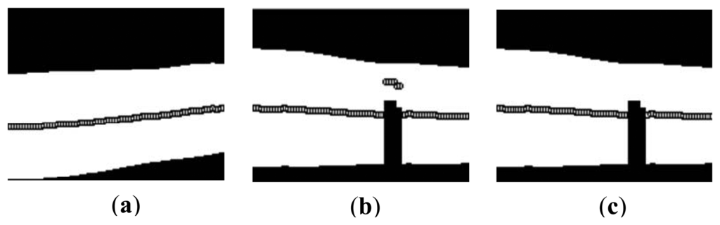 A single linkage clustering method [28] is applied to delete the inaccurate middle points to estimate the facial orientation in [29]. Furthermore, an iterative strategy is developed to prevent random choice of the link distance to get the final estimated orientation. The method can be extended to detect arbitrary objects with mirror symmetry or near symmetry property. Inspired by this, we apply the single linkage clustering method in this paper, to delete the wrong middle points. Since the operator of re-binarization has largely decreased the number of wrong middle points, the iterative strategy proposed in [29] is redundant for the orientation estimation in this paper. By using the single linkage clustering algorithm, the wrong middle points ( , ), i =1, 2, … , p (p is the number of incorrect middle points) in the false background (Figure 8b) can be deleted. Figure 8c shows the binarized finger region with accurate middle points.