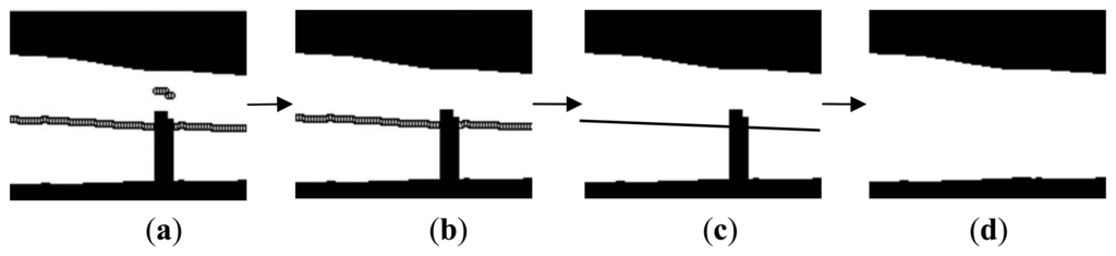 The estimated orientation corrected angle can not only be applied for finger vein image orientation correction, but also employed in filling the broken region for those images with false backgrounds. Assume θ is the estimated finger orientation. With θ and the values of X-axis coming from the wrong middle points ( , ), i=1, 2, …, p , we can calculate their correct values of Y-axis , i = 1, 2, …, p using the line function y = kx + b. Furthermore, the corresponding values of Y-axis of the disappeared edge points can also be computed. Thus, the accurate estimated middle points ( , ), i = 1, 2, …, p can be directly guided to remove the false background. Figure 9 shows the processes to remove the false background. With this operation, the proposed method is robust for segmenting all of the captured images.