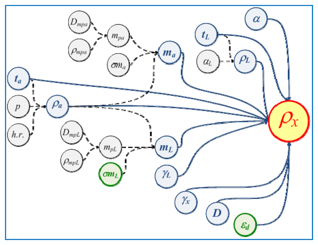 It can be observed from Figure 11 that the input values depend on other secondary variables like the reference liquid density ρL, depends on the thermal expansion coefficient of the liquid αL and of the temperature of the liquid tL. Also in Figure 11, the main variables are distinguished with circles and blue font and the secondary variables in circles and black font. Secondary variables are described as: