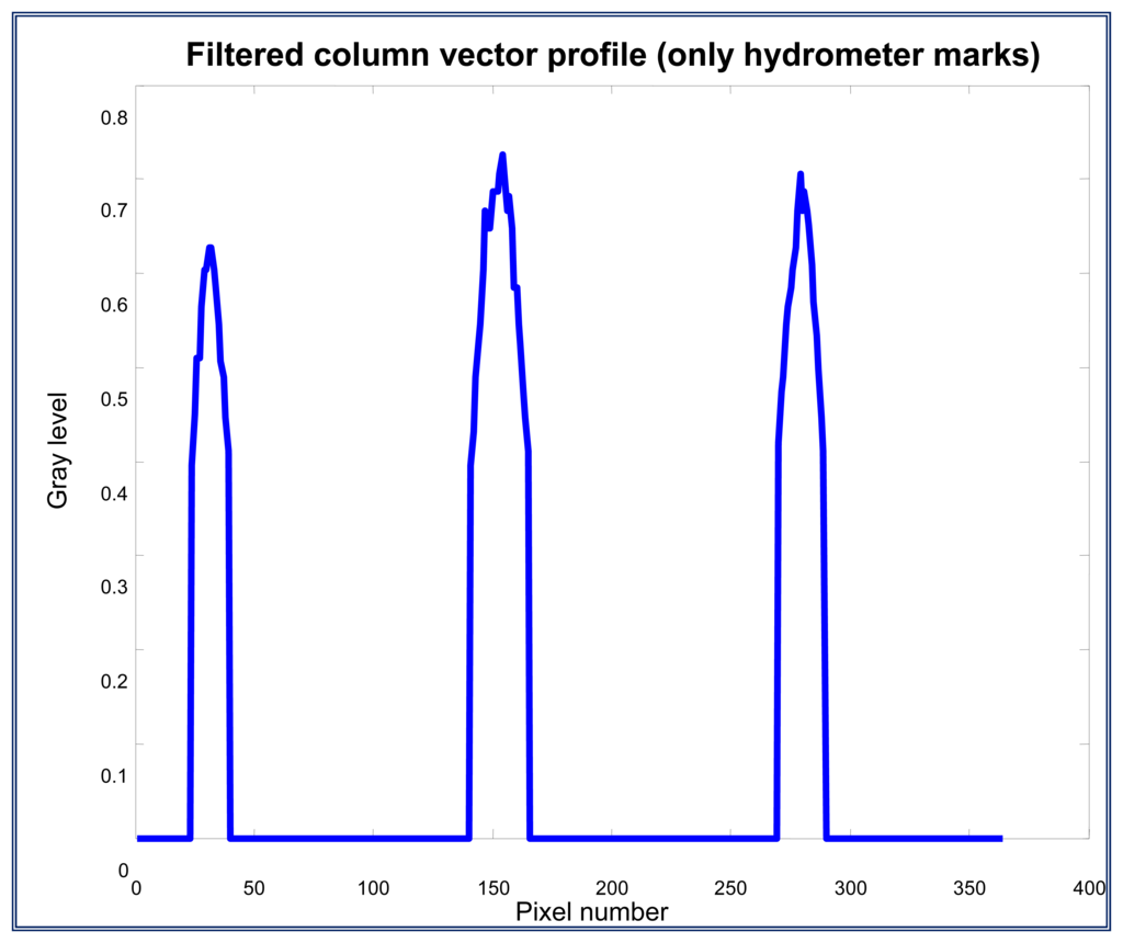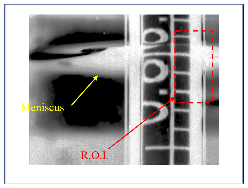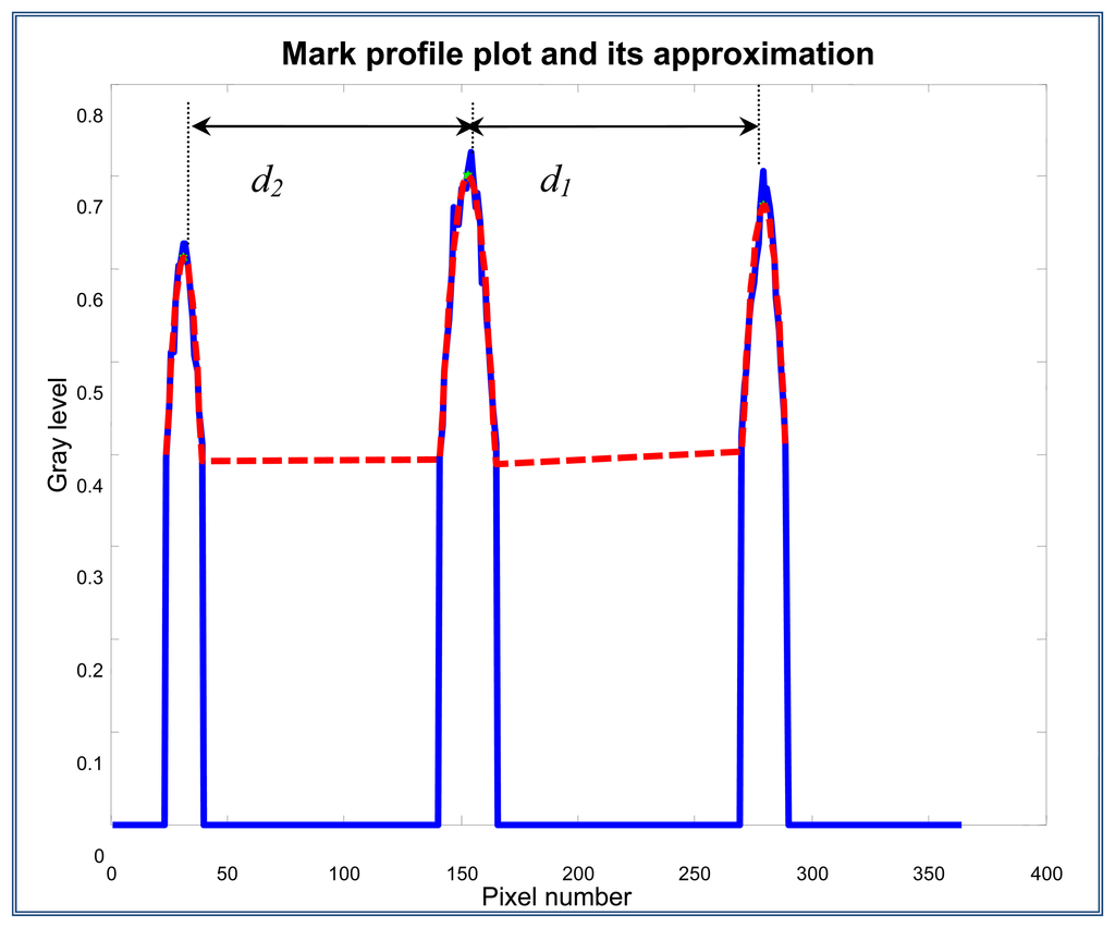 From I2(x,y) the region of interest (ROI), which includes the calibration mark, the mark below the reference mark and its reflection on the surface of the liquid, is selected. Afterwards, a procedure to detect the three marks is applied to a column vector of the ROI, which includes a noise reduction subroutine, where information of pixel position against gray level is relevant. A plot of the data obtained after this procedure shows that each scale mark can be approximate to a second order equation by ordinary least square fitting. The pixel position at maximum gray level for each mark is obtained: p1 for the pixel position of the mark below the calibration mark, p2 for the pixel position of the calibration mark, and p3 for the virtual image (the reflection) of the mark below the reference mark. Then, the distance d1 and d2 are calculated using the values p1, p2 and p3 as follows: