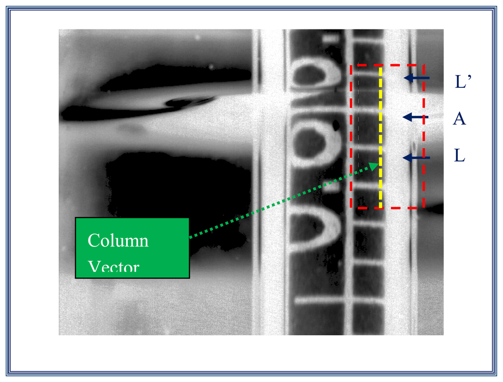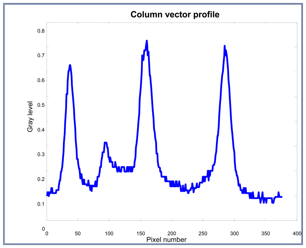 Here, a column vector is selected. This vector contains the information of the three interest marks, L-A-L'. This vector represents the profile or the gray level of the column vector selected and is shown on Figure 15. The profile which includes the interest marks is plotted on Figure 16.