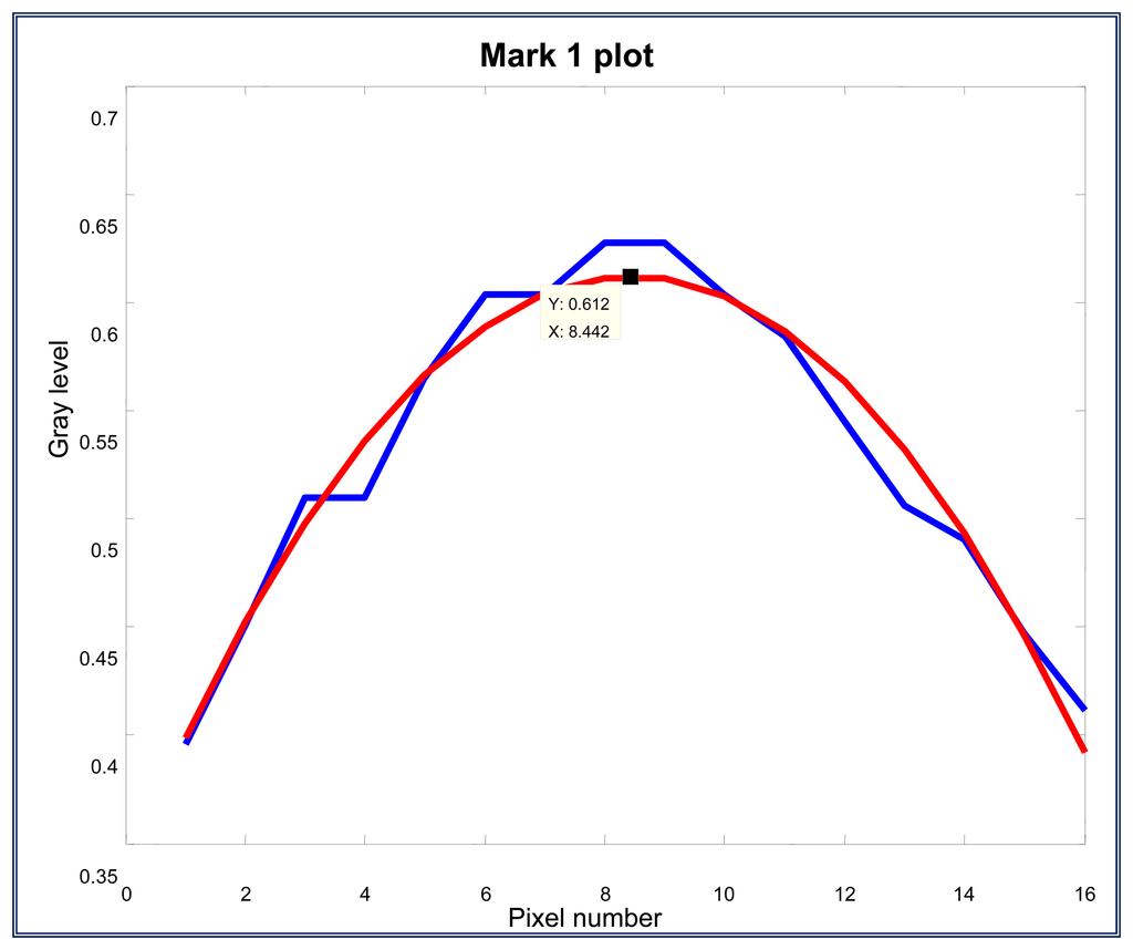 Here, each mark is isolated from the filtered column vector to apply the least square adjustment and fit to a second order polynomial, y = a0 + a1x +a2x2. After the least square adjustment and fitting, the maximum and minimum values of each parabola are determined. In Figure 18, the blue line represents the information of the mark and the least square fitting can be observed on the red line, the second order polynomial equation and the maximum point of each parabola are calculated: