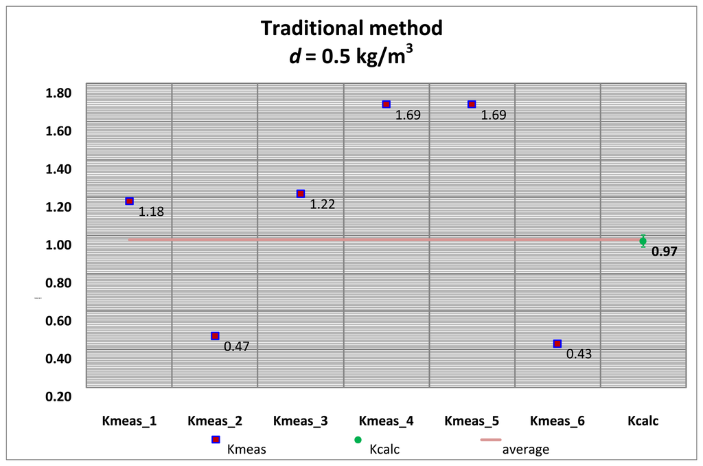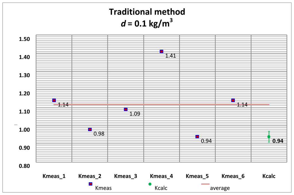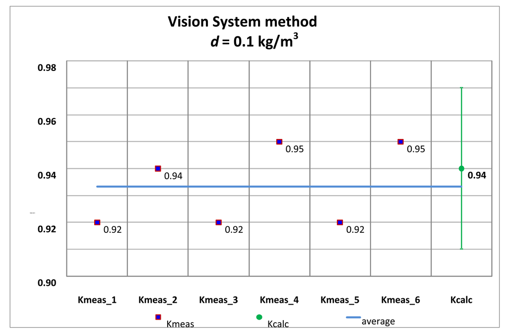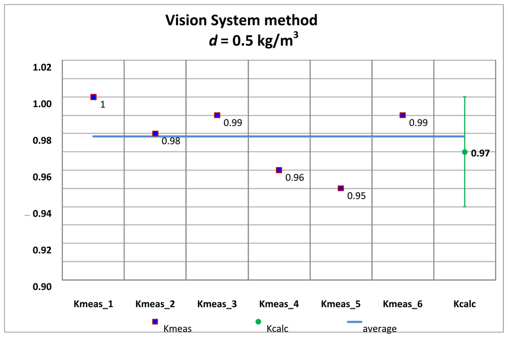 The Kmeas values for each alignment method are compared with the Kcalc values obtained with the pinhole model approach, for both the high accuracy hydrometer (d = 0.1 kg/m3) as well as the medium accuracy hydrometer (d = 0.5 kg/m3) shown in Tables 1 and 2.