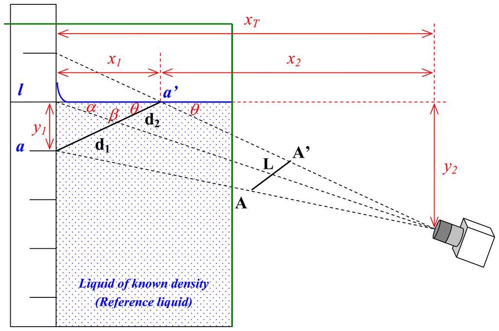 The known values that can be measured are the horizontal distance from the hydrometer stem to the camera (xT), the vertical distance (y1) between two consecutive marks of the hydrometer (usually the mark to be aligned and the mark below immersed in the liquid), and the vertical distance from the liquid surface to the camera (y2).