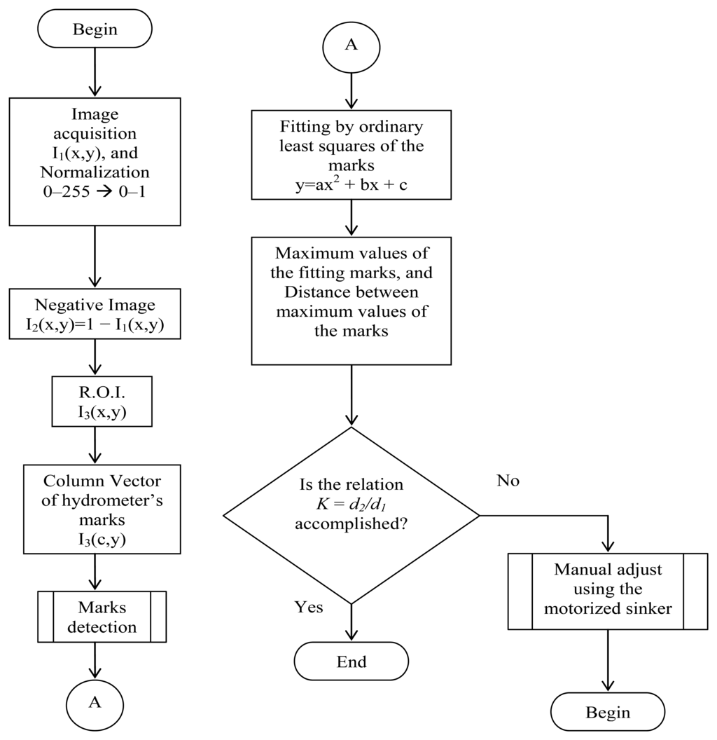 Later, a program acquires an image from the vision system, select the region of interest (ROI) covering the three marks of the hydrometer. Then a column vector is selected at the center of the ROI to detect the marks, and a least squares fitting is performed to fit a parabola of the marks; by doing this, the maximum points of the parabolas select the maximum can be used to measure the distances among them, to get the Kmeas value and compare it with the Kcalc value. In case that these values are not equal, the keypad is used to move the sinker immerse in the liquid on the adequate direction to adjust the liquid level, achieving that the d2 distance change in respect to the position of mark A' (reflection of the mark A of the liquid surface).