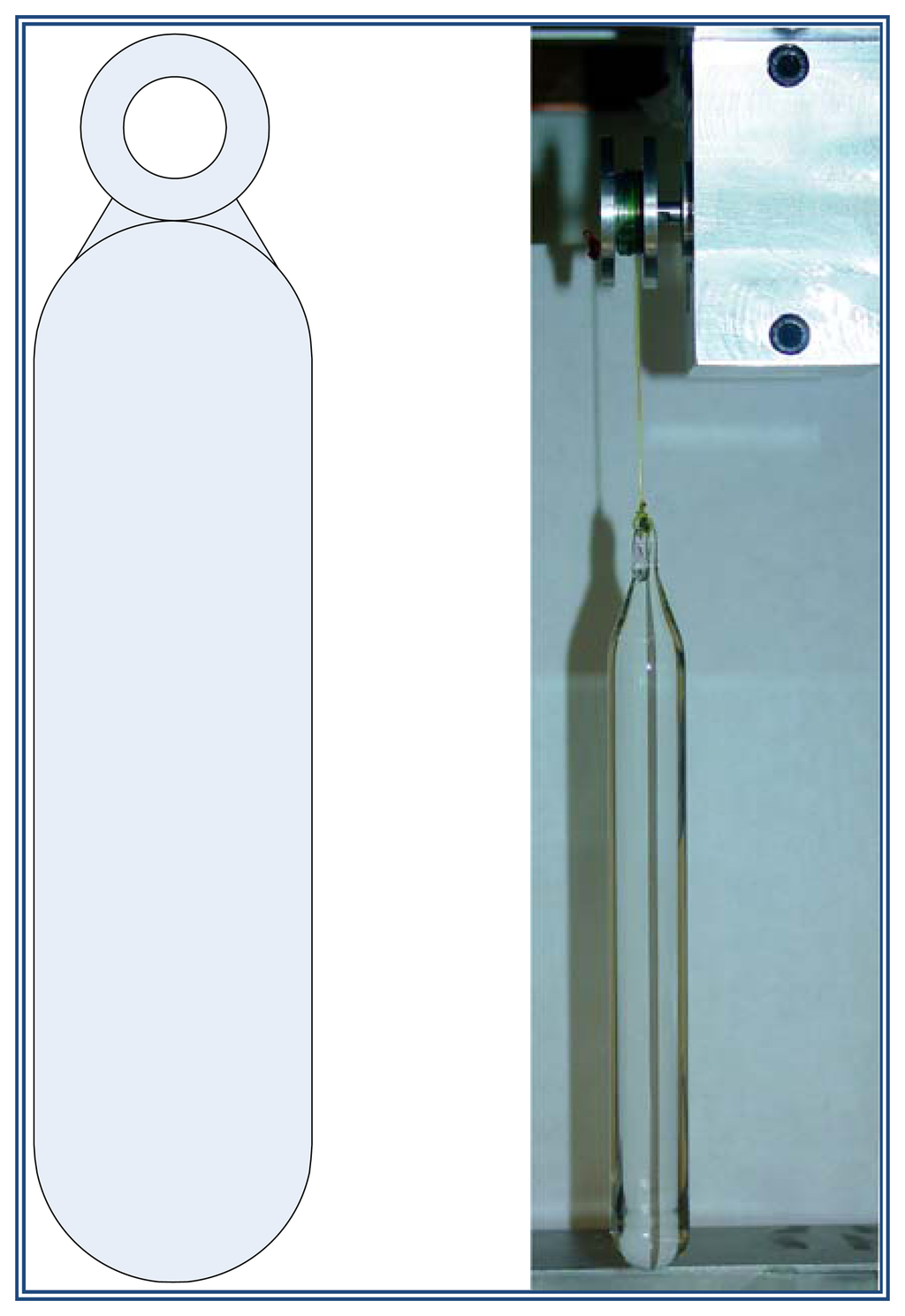 In case that the alignment doesn't occur, it is necessary to immerse or emerge the hydrometer shaft as required in the reference liquid. This occurs by the use of a “sinker” made of a material which does not react chemically with the reference liquid, because if this occurs its density value could change. To avoid the, the material chosen to fabricate the “sinker” was solid borosilicate. The sinker's dimensions are 172.75 mm long and 177.0 mm in diameter. In addition, the sinker has an eyelet so it can be hung. Figure 5 shows a photograph of the sinker.