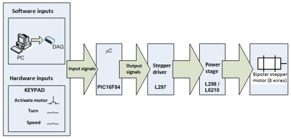 The output signals of the microcontroller are sent to an L297 integrated circuit (STMicroelectronics, Geneva, Switzerland) which works as a driver or interpreter between microcontroller and the power to move the stepper motor. The L297 has the ability to “translate” the digital input signals in the correct sequence of pulses required to be sent to the power amplifier (L298 and L6210 integrated circuits, STMicroelectronics) to properly energize the motor windings and get their movement.