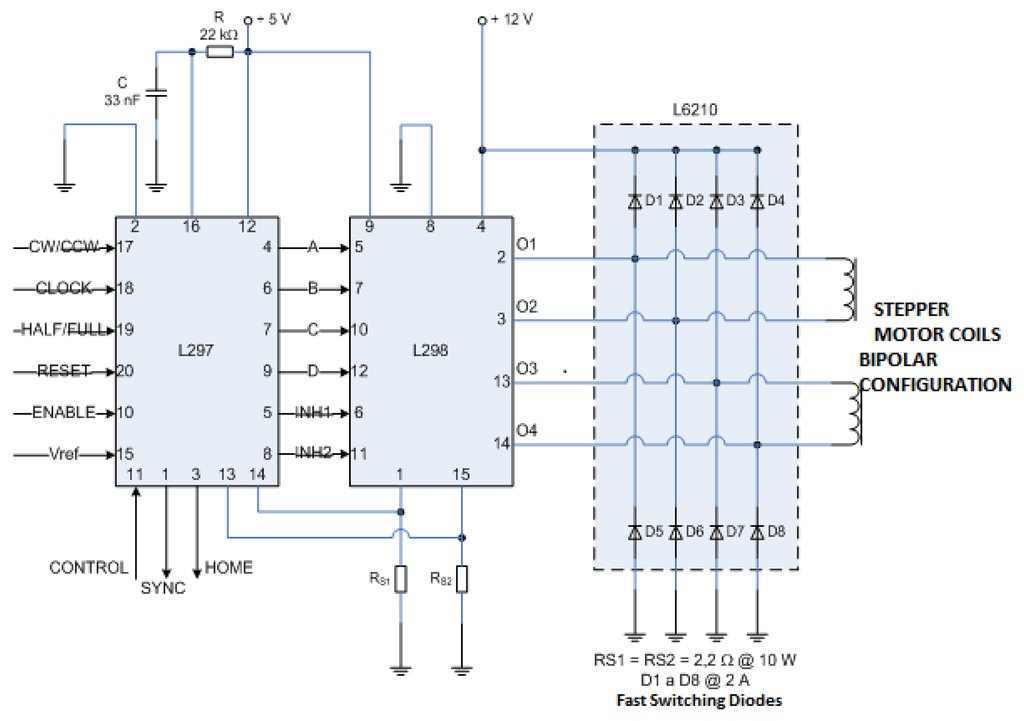 The circuit L297 is connected to a L298 integrated circuit, which internally has a dual H-bridge transistors designed for higher voltage and current values of electrical current through their TTL digital inputs, it can handle inductive loads such as solenoids, relays, DC motors and stepper motors. The emitters of the transistors of the lower H-bridge are connected together and the respective output terminal is used for connecting an external resistor to sense the current flowing through the coil (RS1 and RS2). It uses a separate power supply for making that the circuit logic works at a lower DC voltage. It also has two pins to enable operation of each of the H-bridges. So the motor windings are discharged rapidly during the transition from one sequence to the next to energize, it uses a Schottky fast recovery diode array type capable of maintain peak currents up to 2 A, the diode array is encapsulated in the integrated circuit L6210. Figure 7 shows the connection diagram of integrated circuits L297, L298 and L6210 to the motor windings. The stepper motor used to move the sinker is an Applied Motion brand HT17-075 (Applied Motion Products, Watsonville, CA, USA) model with a resolution of 1.8° per step.