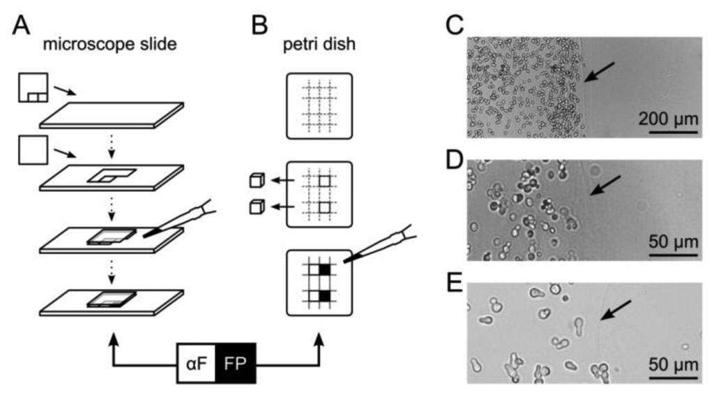For microscopic fluorescence imaging, yeast cells were embedded in 5 × 5 mm compartments on a microscope slide (Figure 1A). Generic transparent adhesive tape was cut such that two squares adjacent to each other could be removed sequentially and attached to a pre-warmed glass slide (30 °C). The first square was removed and a cover slip applied. The resulting cavity was filled with 35 °C-tempered suspension consisting of 1% (w/v) agarose in SD medium with yeast cells adjusted to an optical density at 600 nm (OD600) of 0.75. After solidification, the second tape square was removed and the space was filled with another agarose/yeast suspension, resulting in two adjacent compartments of immobilized yeast cells. SD medium with synthetic α–factor in the second compartment served as a control.