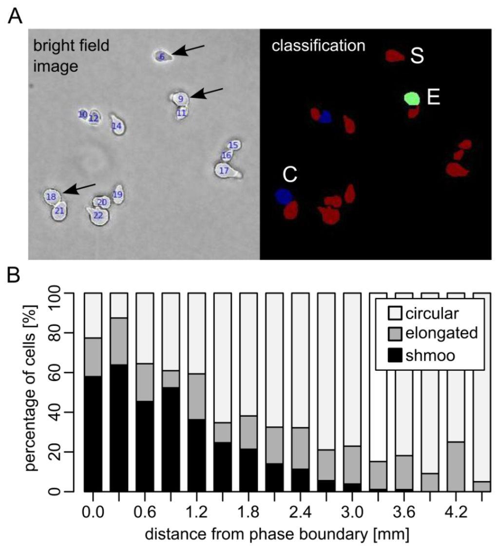 Six hours after incubation, the majority of cells close to the compartment boundary displayed definite mating projections or an elongated shape (Figure 2B). Up to a distance of three millimeters, the fraction of cells displaying a shmoo phenotype gradually decreased. Beyond this distance, mating projections could not be detected. A relatively constant proportion of elongated cells could be observed up to a distance of about four millimeters.