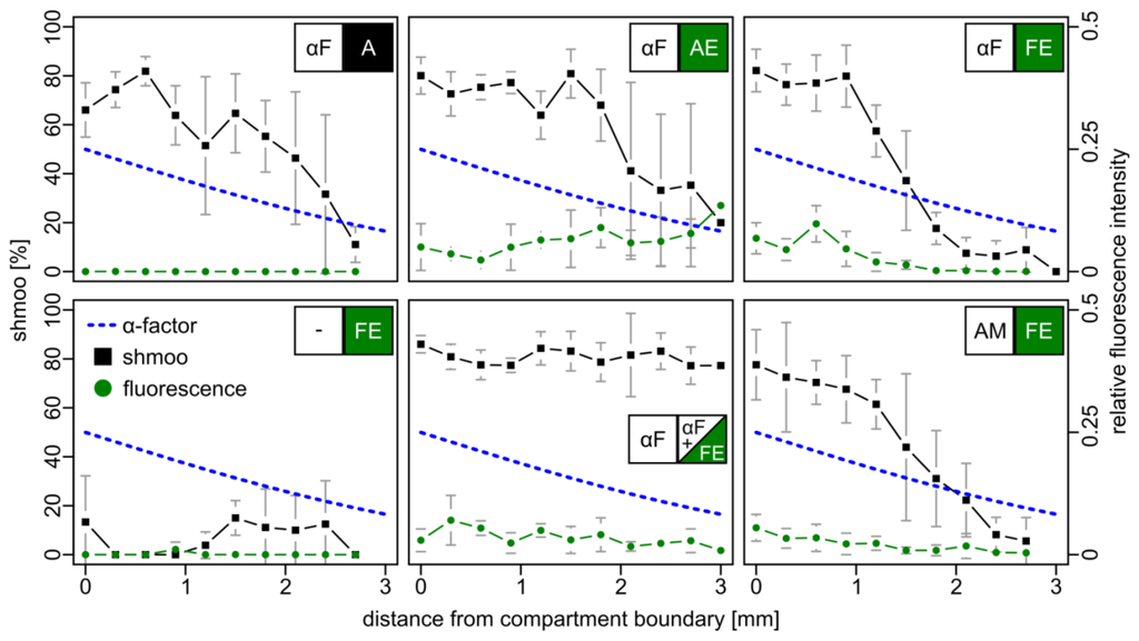 With increasing distance to the compartment boundary, non-fluorescent A cells responded to the α–factor gradient with a gradually declining number of mating projections. AE cells were also characterized by such a shmoo gradient, but additionally emitted weak fluorescence irrespective of their position in the compartment. FE reporter cells exhibited fluorescence that gradually decreased with increasing distance to the boundary, accompanied by a decrease of the number of mating projections. Strikingly, a similar result was observed when the gradient was formed by α–factor secreting AM cells, indicating that the amount of released α–factor is comparable and sufficient for signaling across the two compartments with a dimension of 5 × 5 mm. In a control setup, in which synthetic α–factor was added to both compartments, uniform pheromone distribution yielded cells with uniform fluorescence and a constant fraction of the shmoo phenotype. In the absence of α–factor neither of the two effects was observed.