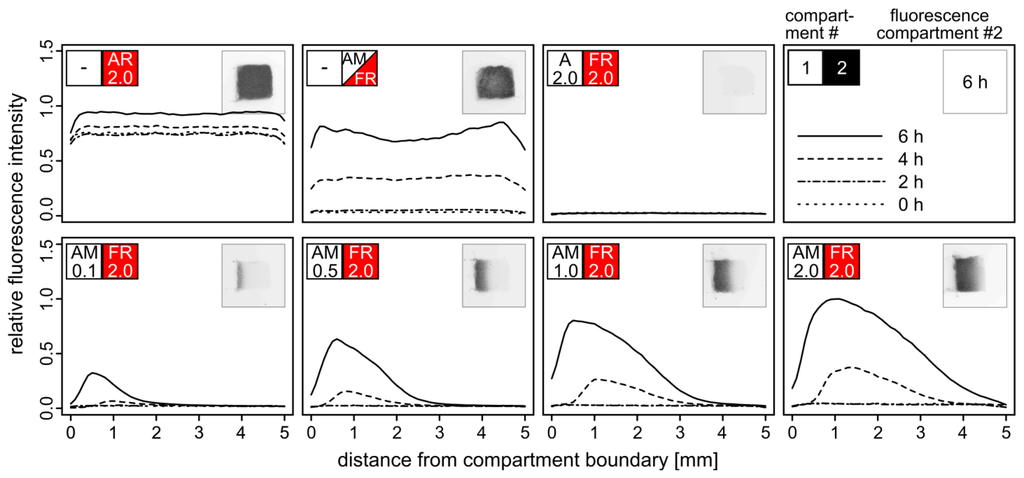 Adjacent cubic compartments were filled with yeast cells embedded in agarose hydrogel yielding different densities of α–factor secreting AM cells and TurboRFP-expressing FR reporter cells. Fluorescence of the FR compartment was monitored in intervals of two hours (Figure 4).