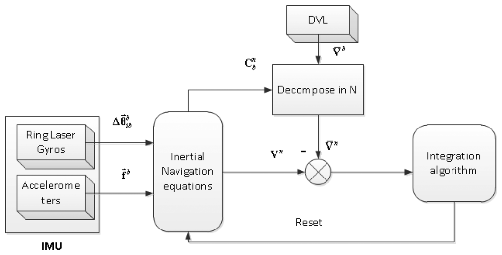 : Since the drifts of Inertial Navigation System (INS) solutions are inevitable and also grow over time, a Doppler Velocity Log (DVL) is used to aid the INS to restrain its error growth. Therefore, INS/DVL integration is a common approach for Autonomous Underwater Vehicle (AUV) navigation. The parameters including the scale factor of DVL and misalignments between INS and DVL are key factors which limit the accuracy of the INS/DVL integration. In this paper, a novel parameter calibration method is proposed. An iterative implementation of the method is designed to reduce the error caused by INS initial alignment. Furthermore, a simplified INS/DVL integration scheme is employed. The proposed method is evaluated with both river trial and sea trial data sets. Using 0.03°/h(1σ) ring laser gyroscopes, 5 × 10−5 g(1σ) quartz accelerometers and DVL with accuracy 0.5% V ± 0.5 cm/s, INS/DVL integrated navigation can reach an accuracy of about 1‰ of distance travelled (CEP) in a river trial and 2‰ of distance travelled (CEP) in a sea trial.1. Introduction