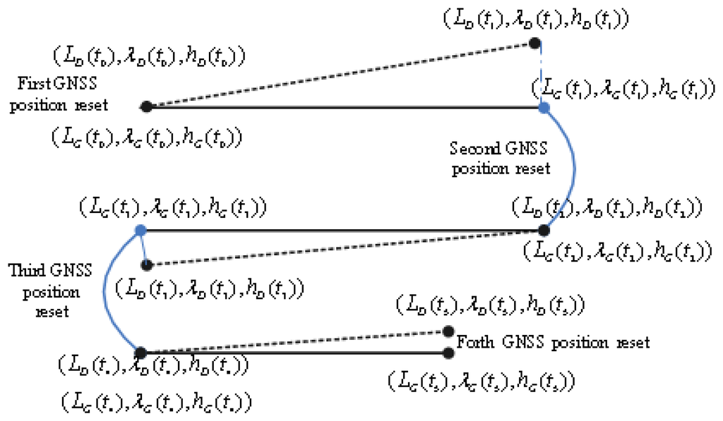 The estimated scale factor and misalignment parameters are used in the subsequent navigation. Record the current position: (LD(t2),λD(t2),hD(t2)), (LG(t2),λG(t2),hG(t2)). Then the AUV takes a 180° turn. After the AUV has travelled over a distance, for example, 8 km, record more positions: (LD(t3),λD(t3),hD(t3)) and (LG(t3),λG(t3),hG(t3)).