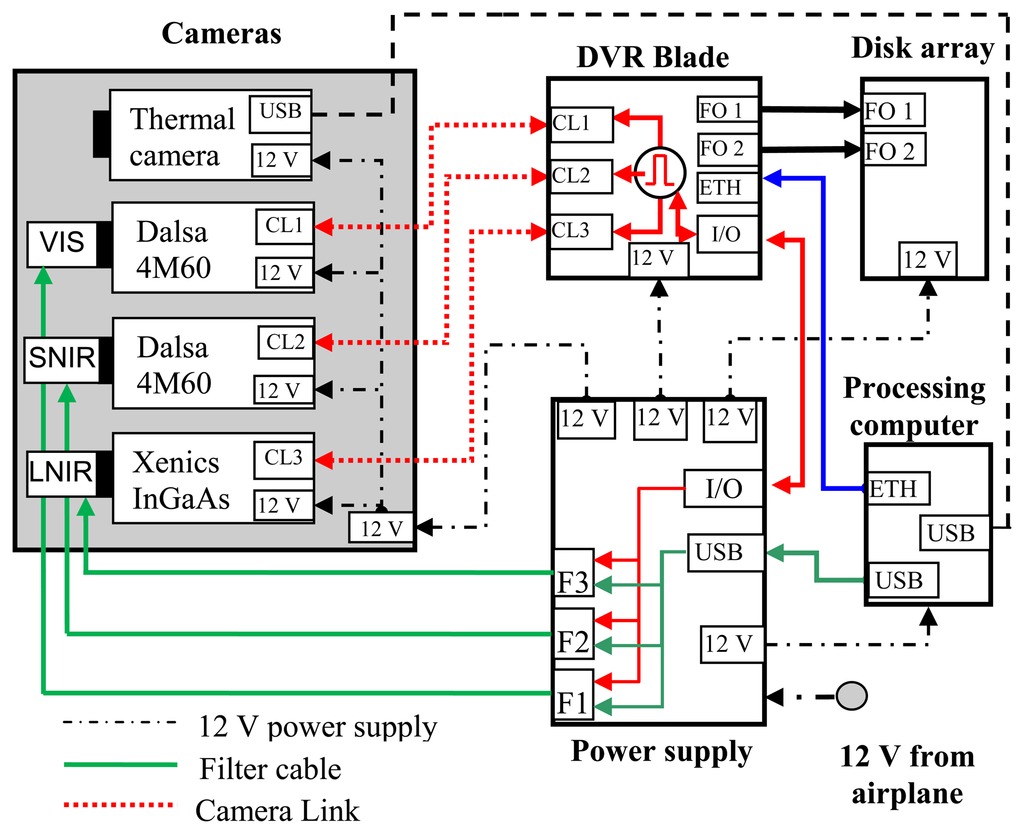 One high-speed Digital Video Recorder (DVR) with three Camera Link inputs (IO Industries DVR Express® Blade) to acquire and manage the data from the cameras and to generate a trigger signal to tune the filter frequency and synchronize the camera acquisition;