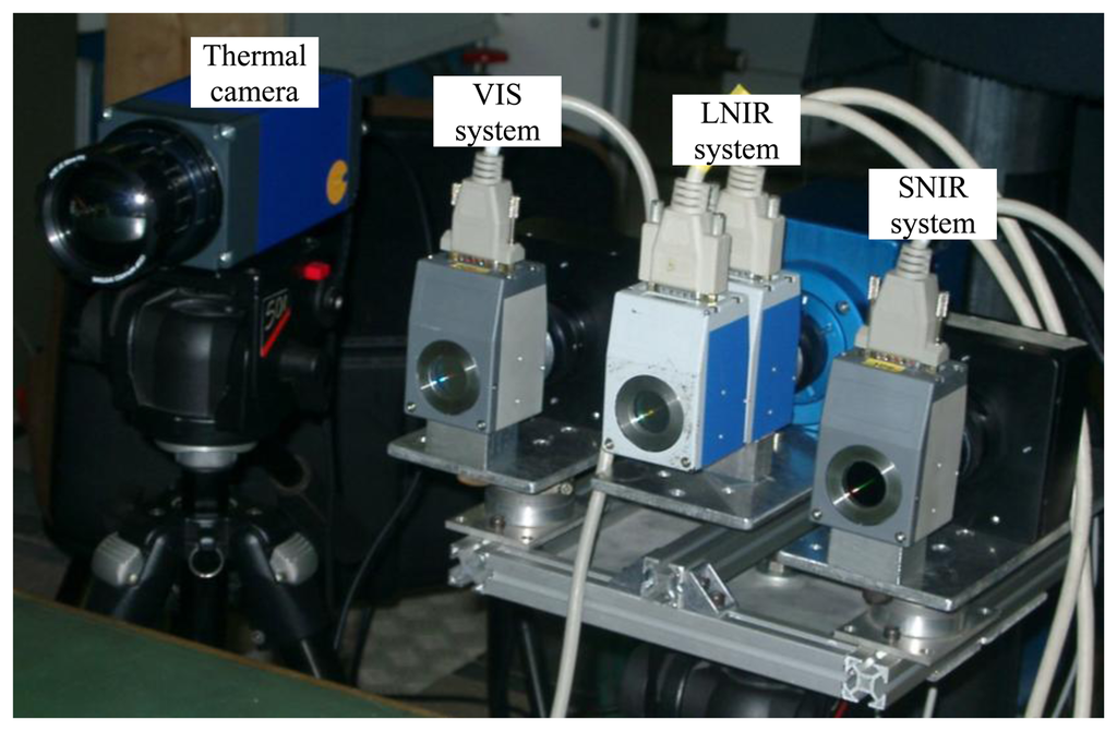 Figure 2 shows a picture of the hyperspectral apparatus equipped with the thermal camera. The first filter frequencies range between 400 nm and 720 nm (visible (VIS) filter), the second one between 650 nm and 1,100 nm (near infrared (SNIR) filter); the third one between 850 nm and 1,800 nm (mid infrared (LNIR) filter). The wavelength of transmitted light is electronically controllable through liquid crystal elements. The transmittance is not constant within the filter wavelength range. VIS filter transmittance increases with the wavelength; SNIR filter transmittance increases until 880 nm and then remains constant; LNIR filter transmittance oscillates tending to decrease for high wavelengths. Though the bandwidth for the VIS and SNIR filters is 10 nm and 6 nm for the LNIR filter, in order to simplify data acquisition and interpretation, all filters are tuned with a step of 10 nm.