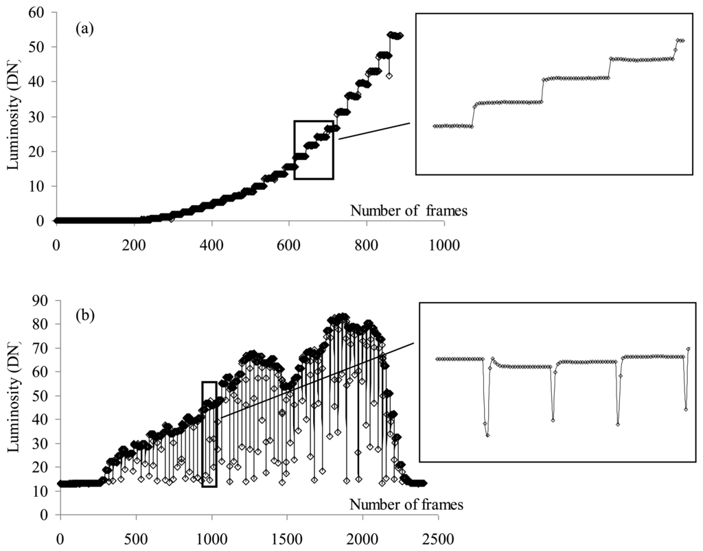 When interference tunable filters were employed, it was necessary to acquire more pictures and tune each filter wavelength to gather the full spectrum of the scene. The cameras simultaneously acquired images at a rate of 25 frames per second and each filter was set to a given wavelength for one second. Roughly 25 images per wavelength were then available. The VIS system (filter + camera), acquiring images from 400 nm to 720 nm with 10 nm step, has acquired 25 images for each of the 33 bands, i.e., approximately 825 images per cycle; the SNIR system, acquiring images for each of the 46 bands, has acquired about 1,150 images for each cycle; finally the LNIR system, tuned within 96 bands, has acquired about 2,400 images for each cycle. Since the filters have been tuned simultaneously and at least two cycles per filter were required, more VIS and SNIR cycles than LNIR cycles were acquired. Figure 3 presents the luminosity (in Digital Number DN) during an acquisition cycle for the VIS and LNIR filters. Due to the filter response time, i.e., the low reliability of the device immediately after the selection of a new wavelength, the first images acquired at a given wavelength, especially for the LNIR filter, have to be rejected. Cameras were equipped with specifically designed achromatic lenses which minimise chromatic and spherical aberration effects.