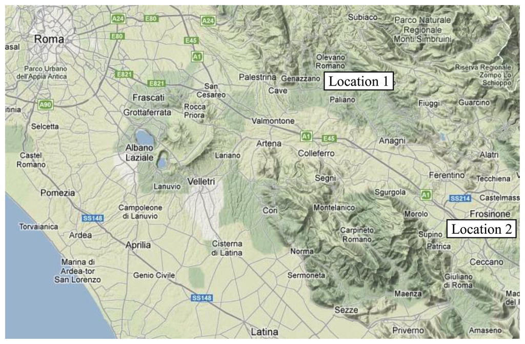 The field survey focused on two sections of the river: one (Location 1), in the municipality of Genazzano, is located upstream of the area that is supposed to be contaminated, the other (Location 2), in Ponte of Tomacella (Patrica-Frosinone), is located downstream (Figure 4). Both areas are characterized by a certain vegetation homogeneity with the predominance of White Willow (Salix Alba) and to a lesser extent of Black Poplar (Populus Nigra). The acquisition system was placed on the ground in both locations.