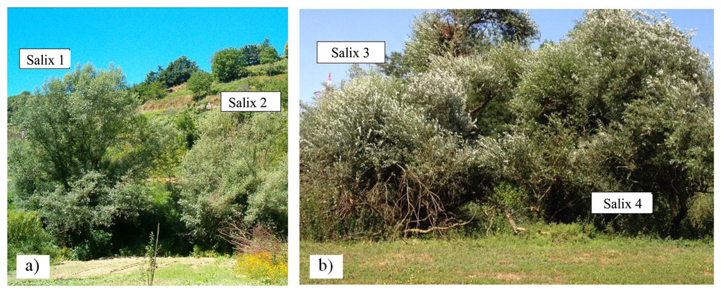 The entire tree canopy or a large part was included in the image. While no soil could be seen through the canopy, portions of sky are visible through the boundary of the canopy. The images were acquired as the sun was roughly at its zenith, in particular between 10 a.m. and 3 p.m., in order to provide maximum sunlight. The scene was orthogonal to the optics and at a distance of a few tens of meters. Figure 5a shows an image of the Salix trees monitored in Location 1, Figure 5b the Salix trees at Location 2. Hyperspectral images of both trees have been acquired within each field survey. Table 2 also reports the object employed for the radiometric calibration of the hyperspectral data.